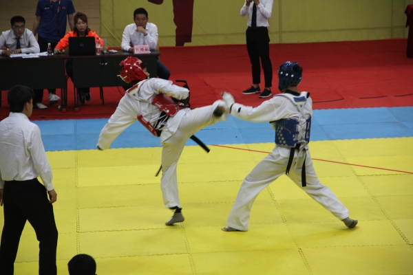 5月10-13日,2018年重庆市大学生跆拳道锦标赛在西南大学体育馆举行,来自重庆地区19所高校的500余名运动员参加了本次赛事。beat365官网跆拳道队在主教练郭健平的带领下参加了大学普通甲组、高水平丙组的品势与竞技两个大项比赛,经过队员们的奋勇拼搏,共获得4金9银7铜的佳绩,同时再次蝉联了甲组品势项目团体总分第一名,实现了该项目的三连冠。主教练郭健平因为带队成绩优异,被组委授予了优秀教练员称号。在本次比赛中,beat365官网跆拳道队品势实力得到了极大的彰显,甲组品势比赛共设置5枚金牌,由经济管理学院张兴强,艾南蓉、机电工程学院杨江,陈飞、材料与化工学院许晓梅、软件工程学院邓滨玥等6名学生组成的品势队共斩获了4项冠军。