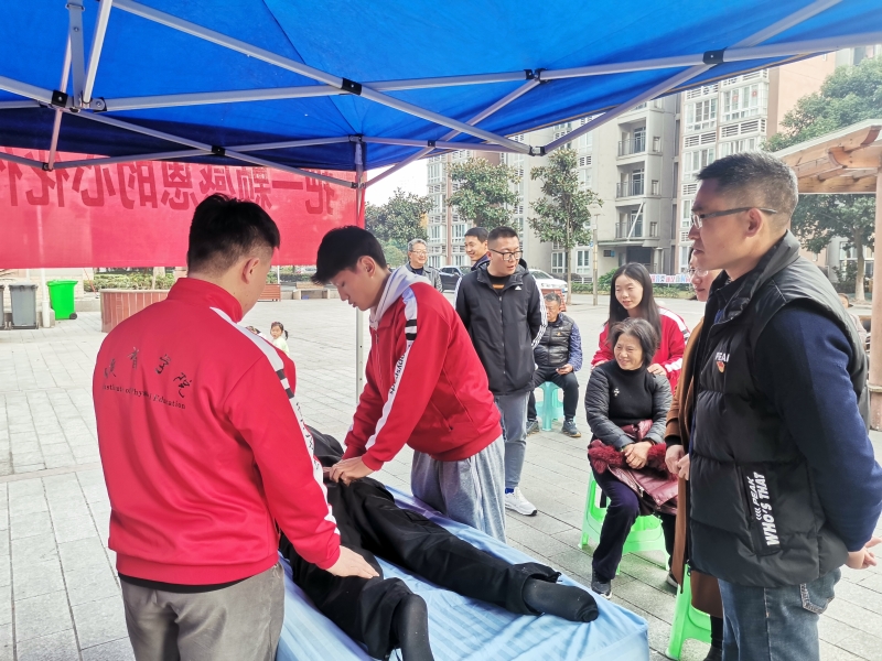 在志愿活动前期,党员教师和志愿服务队队长吴宇航对志愿者进行集中培训。在活动过程中,党员教师邱国荣现场指导学生,不仅为校内老师做好了服务,也帮助同学提高了康复技能。