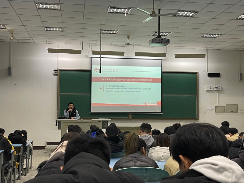 2021年12月,beat365在线唯一官网登录党总支书记李旻,辅导员邵志鹏、卢德强、朱顺全向全院710余名师生开展党的十九届六中全会精神的宣讲。