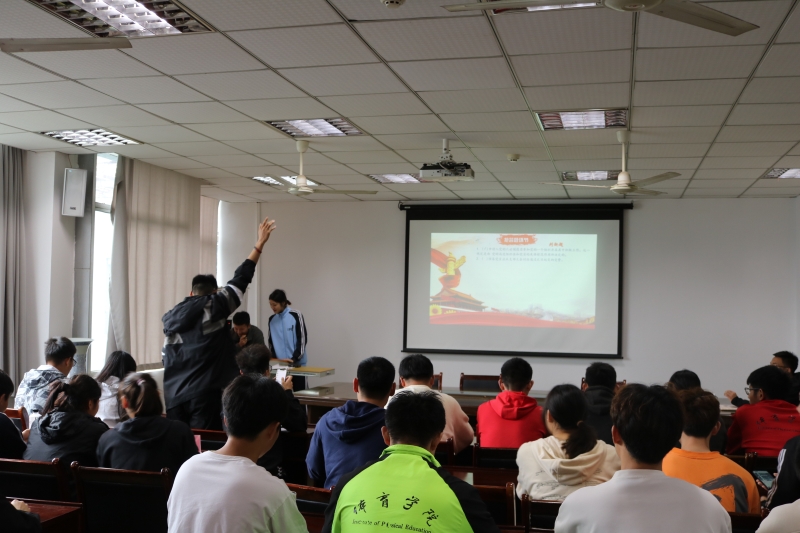 活动开始,全体起立奏唱国歌,接着主持人宣读比赛规则,本次竞赛分为必答题、抢答题和附加题,分成6个小组,各个环节既有单人比拼,也有团队协作。在活动过程中,同学们积极抢答,经过激烈角逐,团体赛:第三组荣获第一名、第二组荣获第二名、第一组荣获第三名,个人赛:杨国艺荣获一等奖,曹钦然、毕舜尧荣获二等奖,唐大棚、梁秋林、陈渝杭、王梓刚、陈必香、帅梦洁、黎森、王艇荣获三等奖。