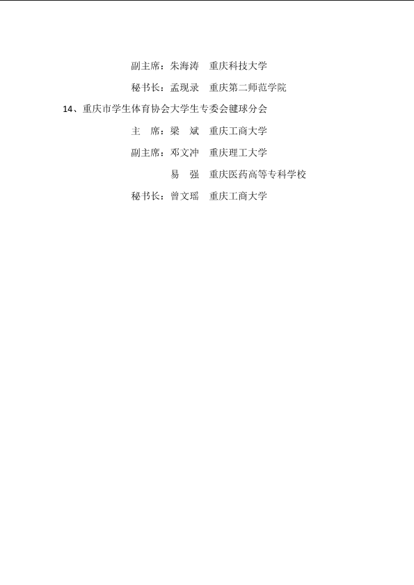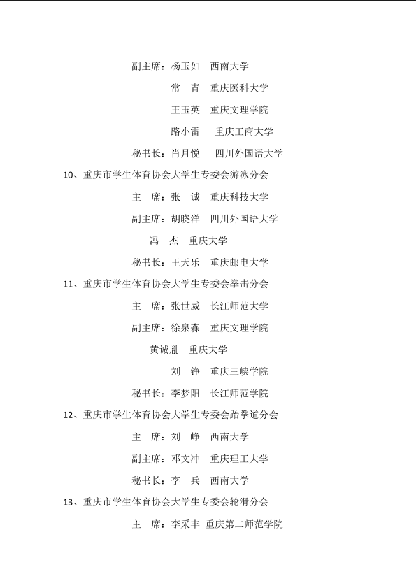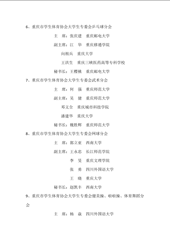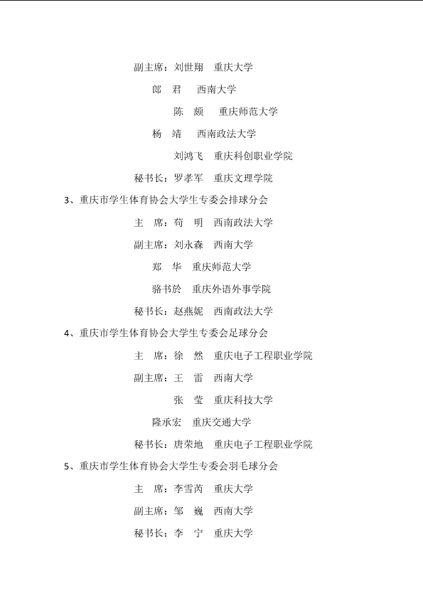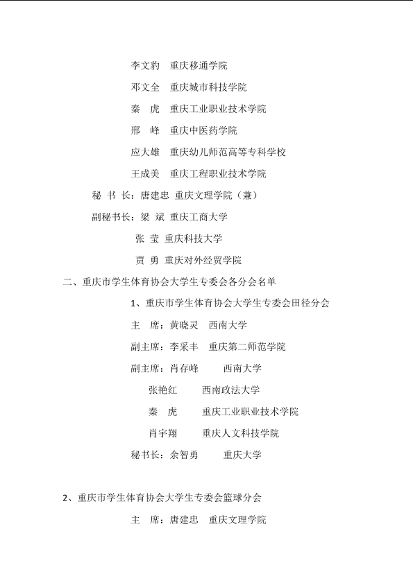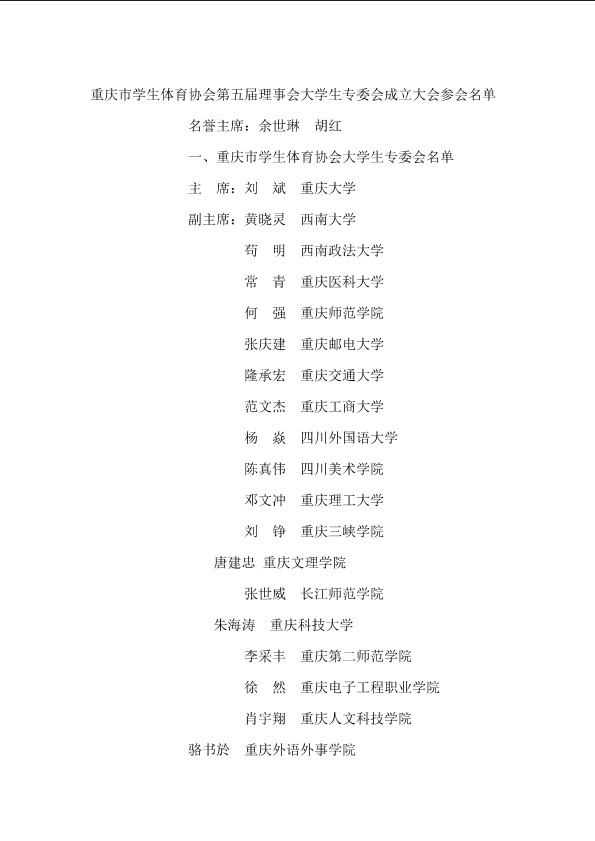 重庆市学生体育协会第五届理事会大学生专委会成立大会参会名单