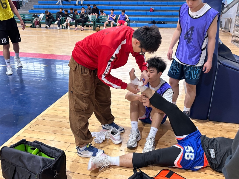 各支参赛队伍迅速进入状态,展开了激烈的角逐。赛场上,运动员们奋勇争先,突破、急停、跳投、暴扣,展现出了高超的球技和顽强的拼搏精神。场边的观众也热情高涨,加油声、欢呼声此起彼伏,为比赛增添了浓厚的氛围。beat365官网运动康复专业学生提供运动防护与急救服务,为运动员保驾护航。